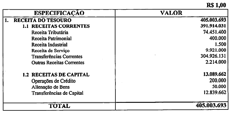 A Receita Orçamentária é estimada em R$ 405.003.693,00 (quatrocentos e cinco milhões, três mil, seiscentos e noventa e três reais).