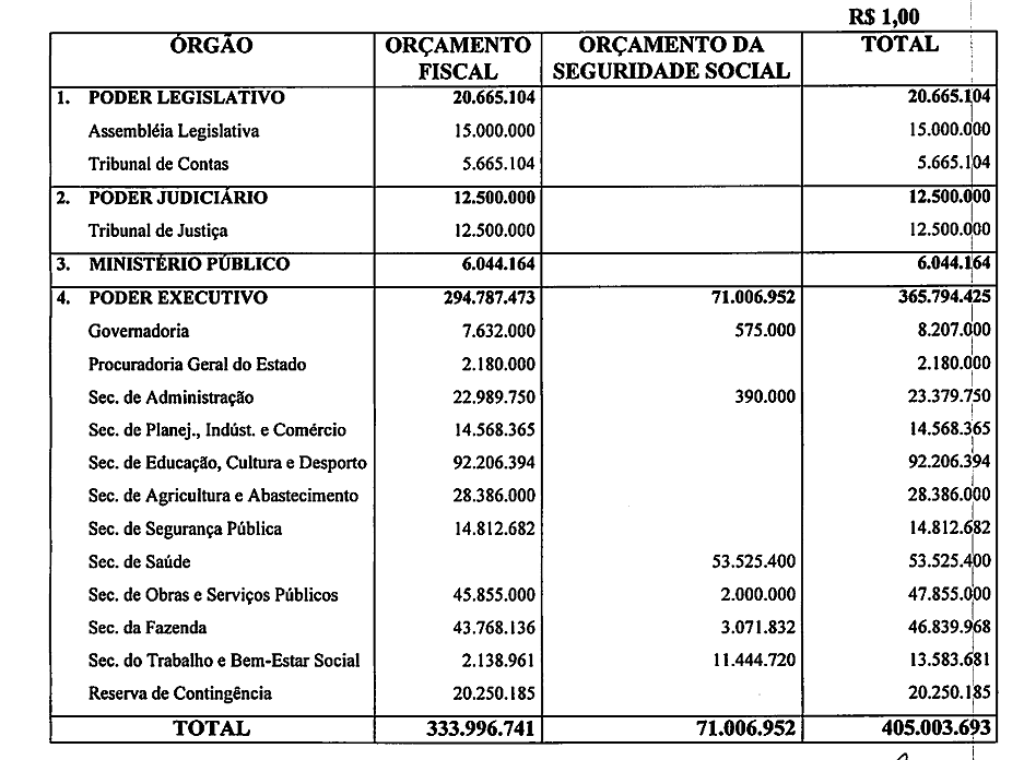 R$ 71.006.952 (setenta e um milhões, seis mil, novecentos e cinqüenta e reais) no Orçamento da Seguridade Social.
