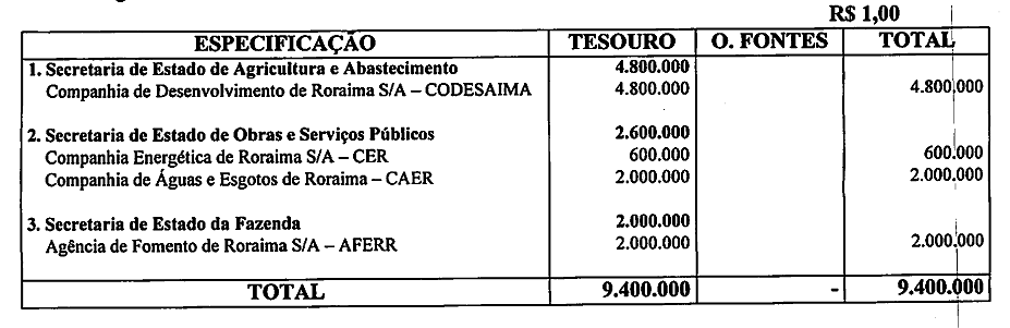 A despesa do Orçamento de Investimento das Empresas em que o Estado detém a maioria do capital com direito a voto, observada a programação constante do Anexo III, desta Lei, é fixado em R$ 9.400.000,00 (nove milhões e quatrocentos mil reais), com o seguinte desdobramento: